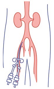 (Picture below: The vascular catheter has two ports, allowing blood to leave through one port and enter through another.. or as my other half says: its like a tap for hot and cold water!)