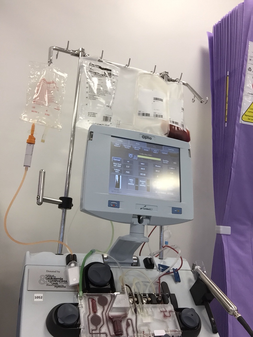 Blood left through one port, went into the separator machine where the stem cells were separated and removed… the blood then returned back into my body via the other port.. the whole process took just over 4 hours in total.. i had to remain attached to the machine the whole time.. thankfully it went smoothly… (just a small interesting fact.. says the medic.. this same machine is used for patients with sickle cell disease who need to have their sickle red cells removed and replaced with healthy red cells).
