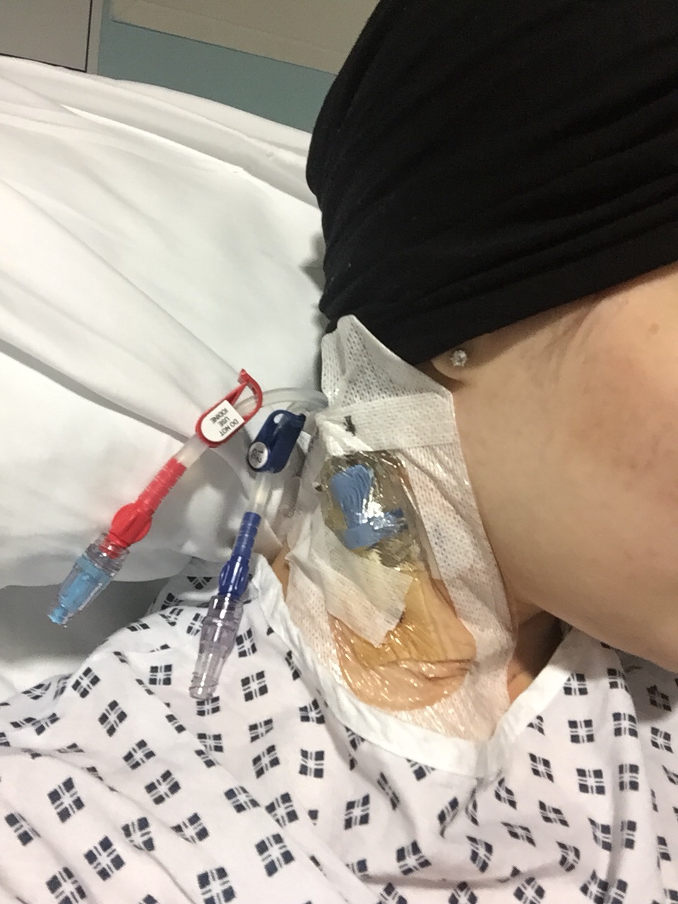 I have a very very high pain threshold.. but this vascular catheter was painful and uncomfortable.. the tube feels rigid, its actually a bit bigger than I thought it would be.. maybe I am just a drama queen but honestly it was awful! My neck felt stiff, eating and sleeping were a real struggle especially on the first day.. I remember the night after having the vascular catheter inserted I couldn’t do much.. overnight my nurse and her assistant were amazing.. they checked on me regularly.. adjusted my pillows so I was comfortable, they helped me drink water.. it may sound petty but seriously sometimes it’s something so small that makes a big difference to a patient’s experience..