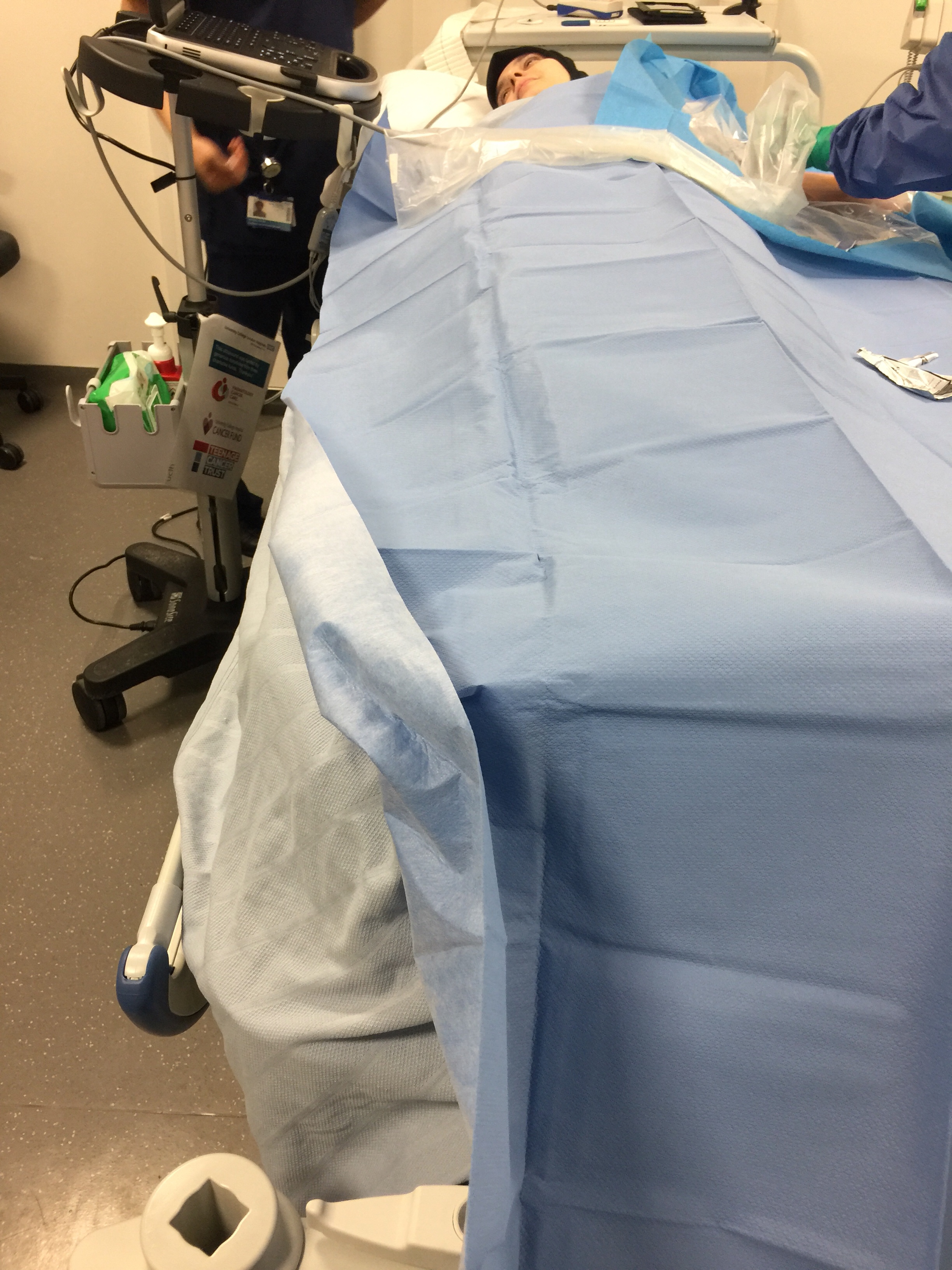 As i have awful veins (thanks to all the chemo drugs i’ve had) I needed a vascular catheter inserted (a plastic tube inserted into a vein using the guidance of an ultrasound)… the initial plan was to have this inserted into a vein in my groin (see my last post), however on the day the anaesthetist decided my white blood count was too low, to reduce the chances of a infection he decided it would be safer to insert the vascular catheter in my neck (Jugular vein)… so i was taken into the operating theatres where this was done under a local anaesthetic..